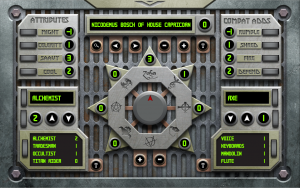 To illustrate, here is the first panel a player will use, the character generation panel, and a character that has been created using it – Nicodemus Bosch, a Ledite of House Capricorn (inspired by Jethro Tull, of course):